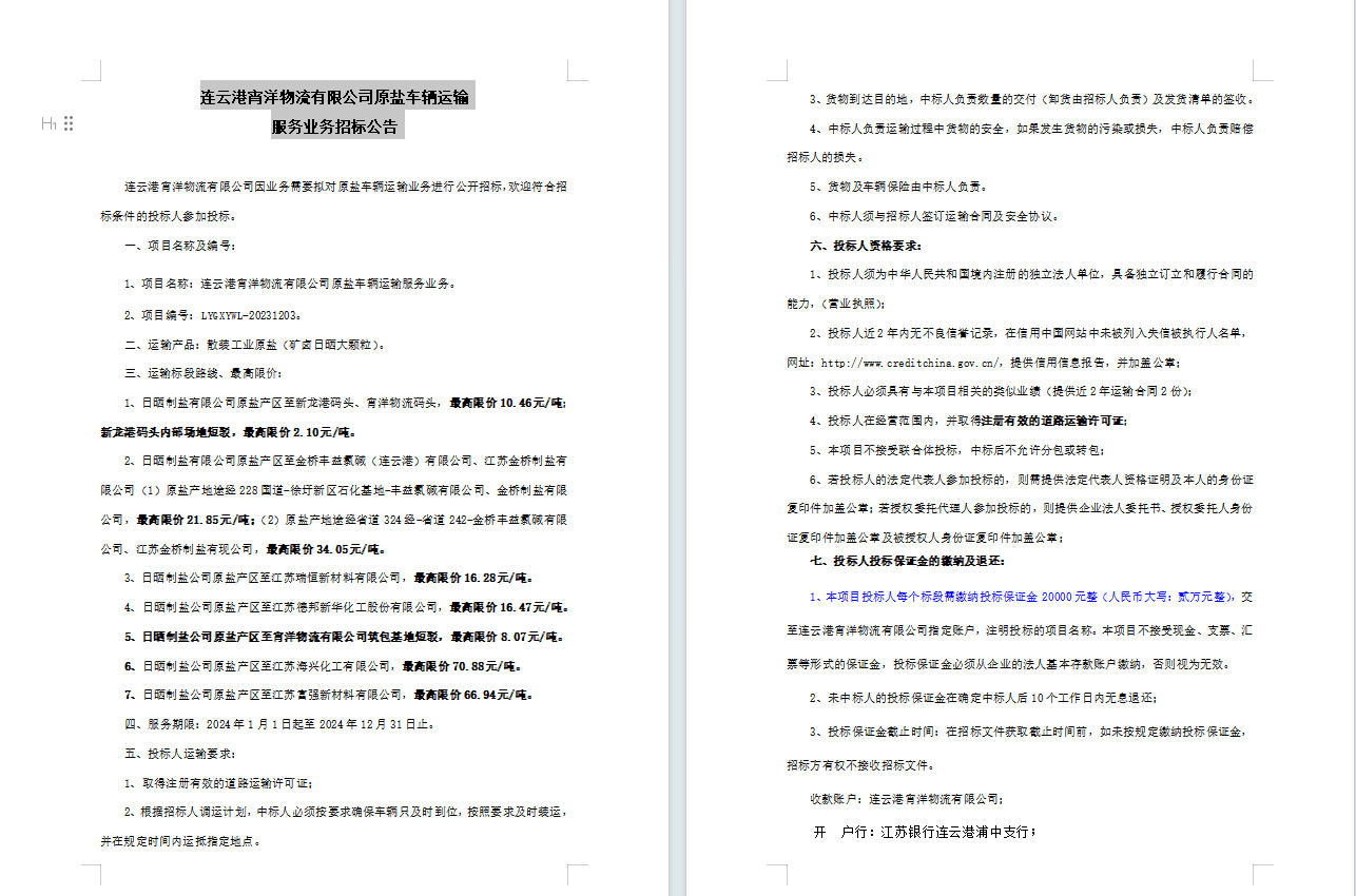 連云港宵洋物流有限公司原鹽車輛運(yùn)輸服務(wù)業(yè)務(wù)招標(biāo)公告
