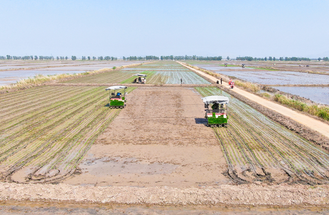 芒種時節(jié),又到一年夏種高峰時期,青口公司進入插秧忙的季節(jié)。水稻塑盤育秧經(jīng)過近一個月的精心管理,秧苗長勢好,機器手正熟練地操作插秧機在稻田里穿梭,一撮撮青翠的秧苗被整齊有序地插在水田里,呈現(xiàn)出一幅綠色生態(tài)的耕種畫卷。