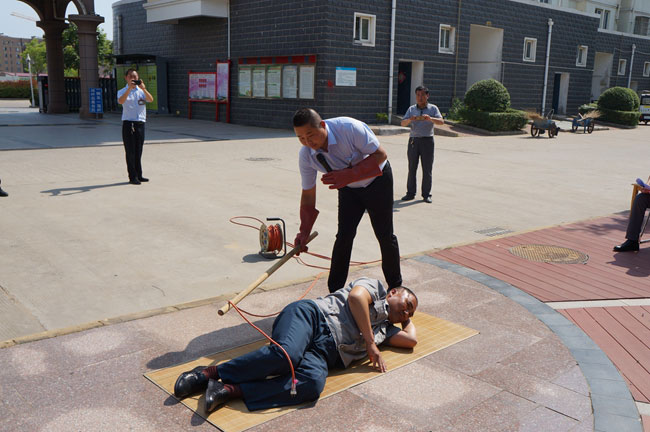 ? ? ? ? ?本次演練模擬一名物業(yè)維修人員施工不慎碰到裸露的電線,導(dǎo)致觸電倒地。在演練現(xiàn)場,專業(yè)電工、醫(yī)護(hù)人員先向觀摩人員詳細(xì)講解了觸電急救、人工呼吸及胸外心臟擠壓等救援理論知識,并進(jìn)行施救演示。經(jīng)過 20多分鐘的演練,順利完成了演練任務(wù)。演練結(jié)束后,安全技術(shù)部負(fù)責(zé)人對演練情況進(jìn)行綜合點評,并對泰祥員工安全知識進(jìn)行培訓(xùn),泰祥公司現(xiàn)場發(fā)放了安全用電小常識等宣傳材料。通過此次演練使員工對觸電事故的應(yīng)急救援步驟和方法有了更深的認(rèn)識,進(jìn)一步提高職工觸電急救的能力,有效地提高了職工防范安全風(fēng)險的意識。