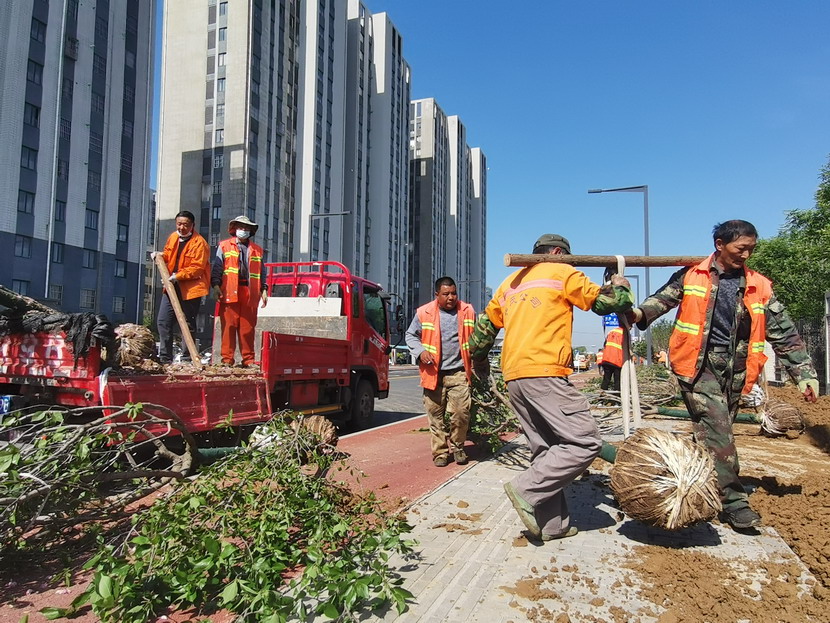 在中科院,只見工程車輛來來往往、橙色身影忙忙碌碌……到處都是一派繁忙、紅紅火火的景象。闖將孫玉虎,虎將金華穿梭在工程現(xiàn)場,親自指揮調度綠化工程收尾工作。大家分工有序:定點劃線、搬運苗木、栽植澆水、垃圾清理……有條不紊。中午時分,熾熱的陽光照在臉上也是火辣辣的,忙碌了一上午的工人大汗淋漓,擰開瓶蓋,咕嚕咕嚕喝了幾大口涼水,用袖子蹭了下額頭的汗,又干勁十足地投入到工作中。