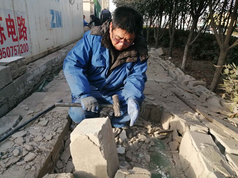 據悉,該處墻頭整體倒塌,大多數磚塊沒有受到損壞。志愿者們一塊一塊的挑選、清理、搬運,將可以回收利用的磚塊整理好,用于墻頭的修葺。水泥、沙的配比不太熟悉,天氣寒冷如何做好防凍,怎么辦?臨達公司的退休老黨員主動站了出來,為圍墻修葺工作做指導,提供幫助。經過兩天的奮戰(zhàn),將倒塌的墻頭修葺好,并拉好了美化綠布。