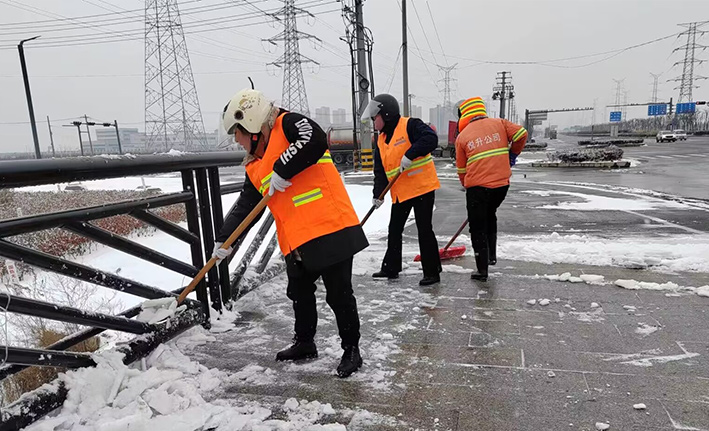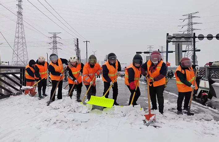 在白雪皚皚的雪地里,身穿橘黃工作服的保潔工人就是最美的點(diǎn)綴,他們頂著風(fēng)雪吹打臉頰,兩人一組、三人一對(duì),配合默契,揮動(dòng)手中鐵銑,用力拋灑融雪鹽斤80多噸,10余車。道路橋粱兩側(cè),人行輔道邊上,公司上下齊心協(xié)力,9名班長在公司統(tǒng)一調(diào)配下,帶領(lǐng)班組人員,人工清除大小橋梁兩側(cè)積雪30多座,人行輔道長達(dá)3000多米長,站臺(tái)、叉路口積雪100多處,為保障恢復(fù)雪后新城環(huán)境整潔而努力工作。大型清掃設(shè)備駕駛員全員齊上陣,安全行車裝運(yùn)融雪鹽斤里程達(dá)200多公里,工作時(shí)長10個(gè)多小時(shí),安全操作鋤雪機(jī)械清理張圩互通引橋,埒子口大橋等路段長達(dá)5000多米長,有力彰顯機(jī)械破冰、除雪強(qiáng)大功能。(楊波)