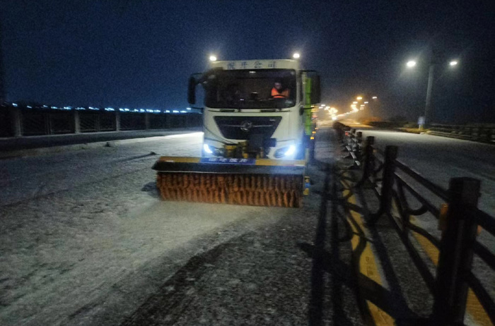 截止早上7點,悅升公司共出動機械設(shè)備10臺、人員260余人,對橋梁和重點結(jié)冰地段使用融雪劑150余噸,及時消除路面冰凍隱患100余處。