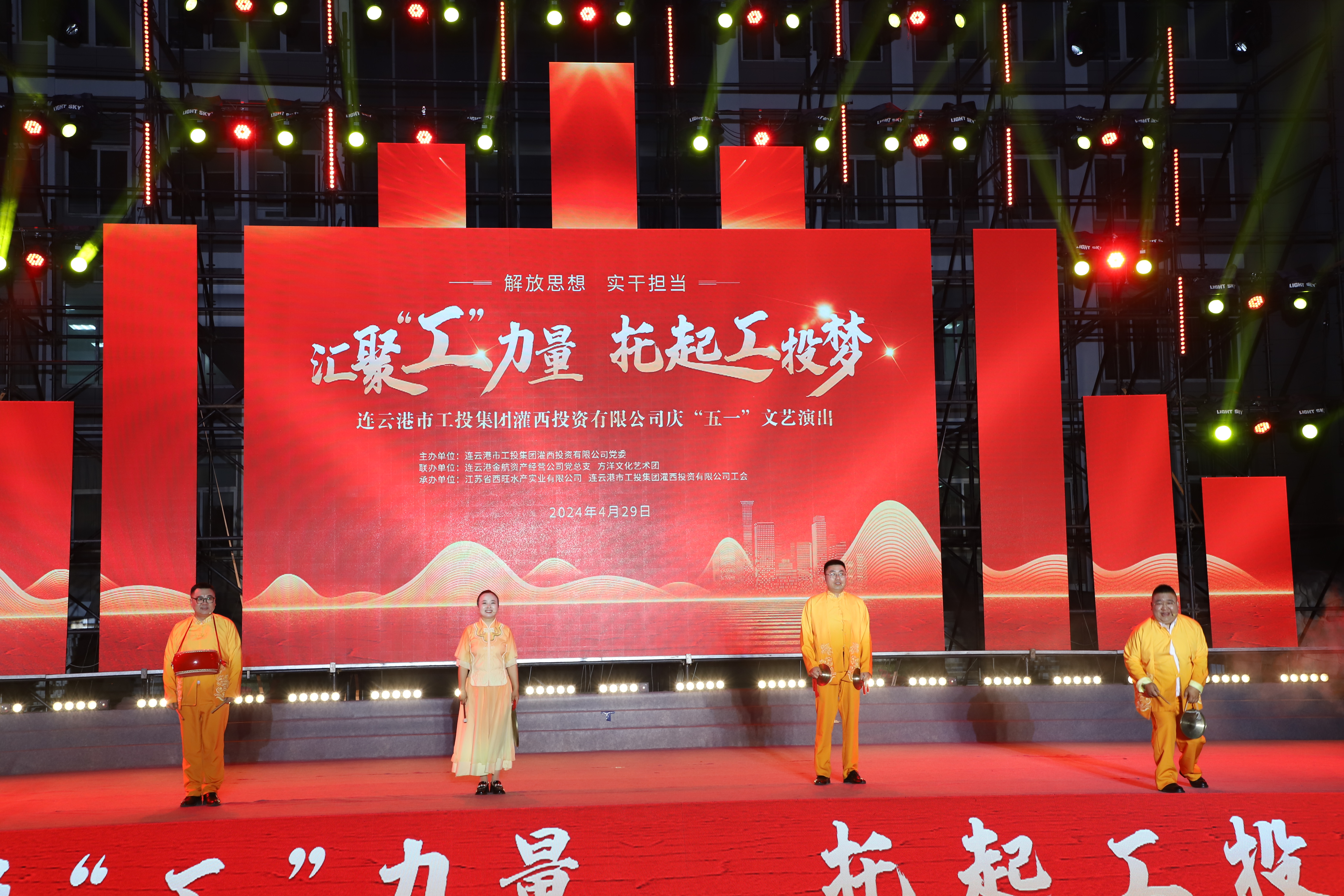 4月29日晚,灌西投資公司《匯聚“工”力量,托起工投夢》慶“五一”文藝演出在機關大樓前廣場舉行。本次活動由灌西投資公司黨委主辦,連云港金航資產(chǎn)經(jīng)營公司黨總支、方洋文化藝術(shù)團聯(lián)辦,旨在通過藝術(shù)的形式,營造崇尚勞模、學習先進、尊重勞動的良好氛圍,豐富公司員工的文化生活,激發(fā)干事創(chuàng)業(yè)熱情。集團公司領導張六林、戴鴻鳴、汪群及部分部門負責人,灌西、金航資產(chǎn)經(jīng)營公司領導班子成員出席演出活動,縣臨港產(chǎn)業(yè)區(qū)管委會、華能灌云清潔能源發(fā)電責任有限公司、徐圩新區(qū)方洋集團等有關領導受邀觀看演出。
