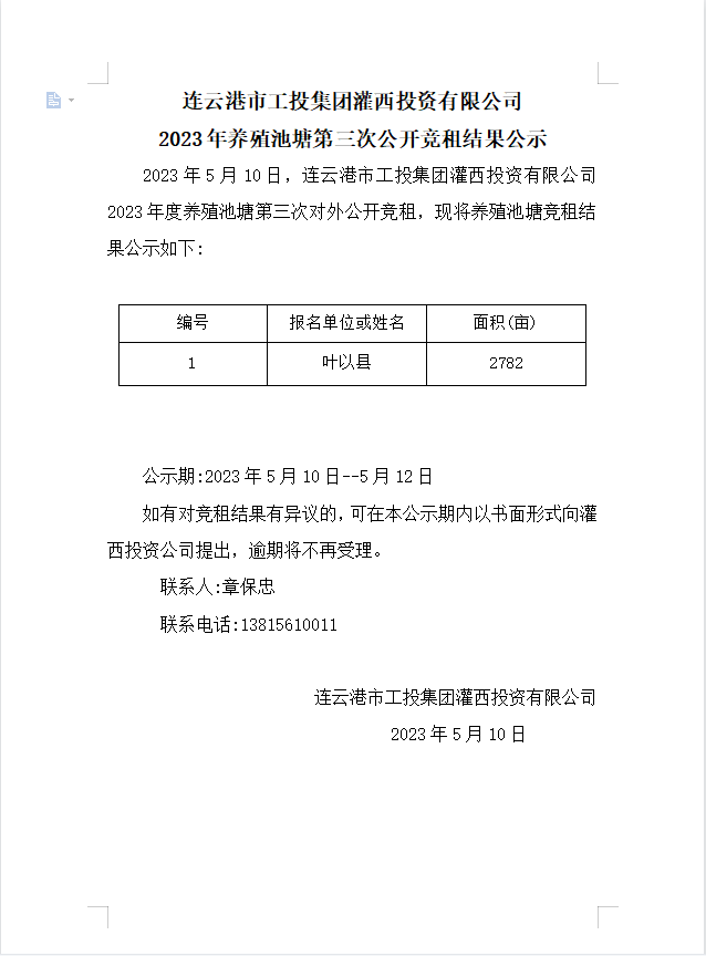 連云港市工投集團灌西投資有限公司2023年養(yǎng)殖池塘第三次公開競租結果公示