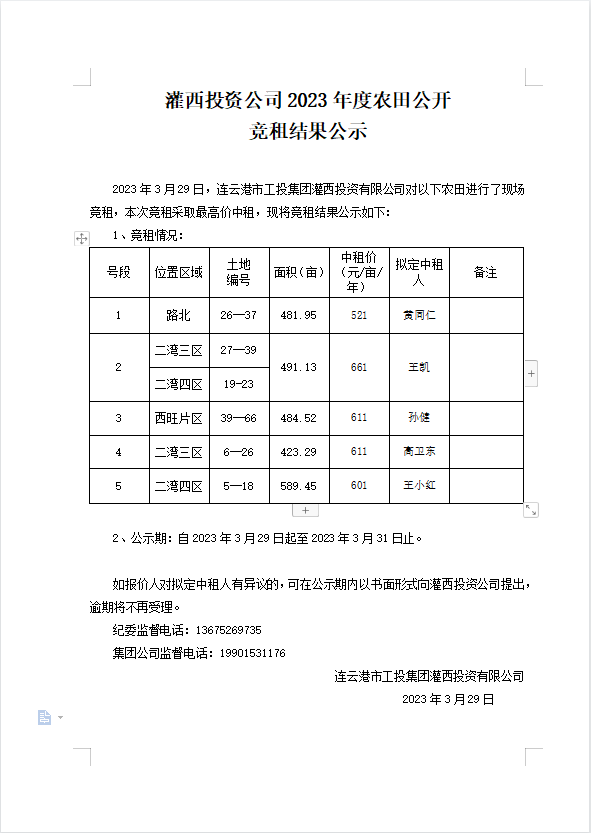 灌西投資公司2023年度農(nóng)田公開 競(jìng)租結(jié)果公示